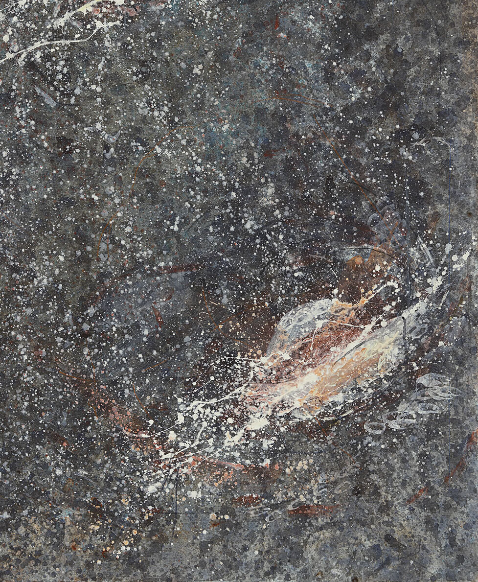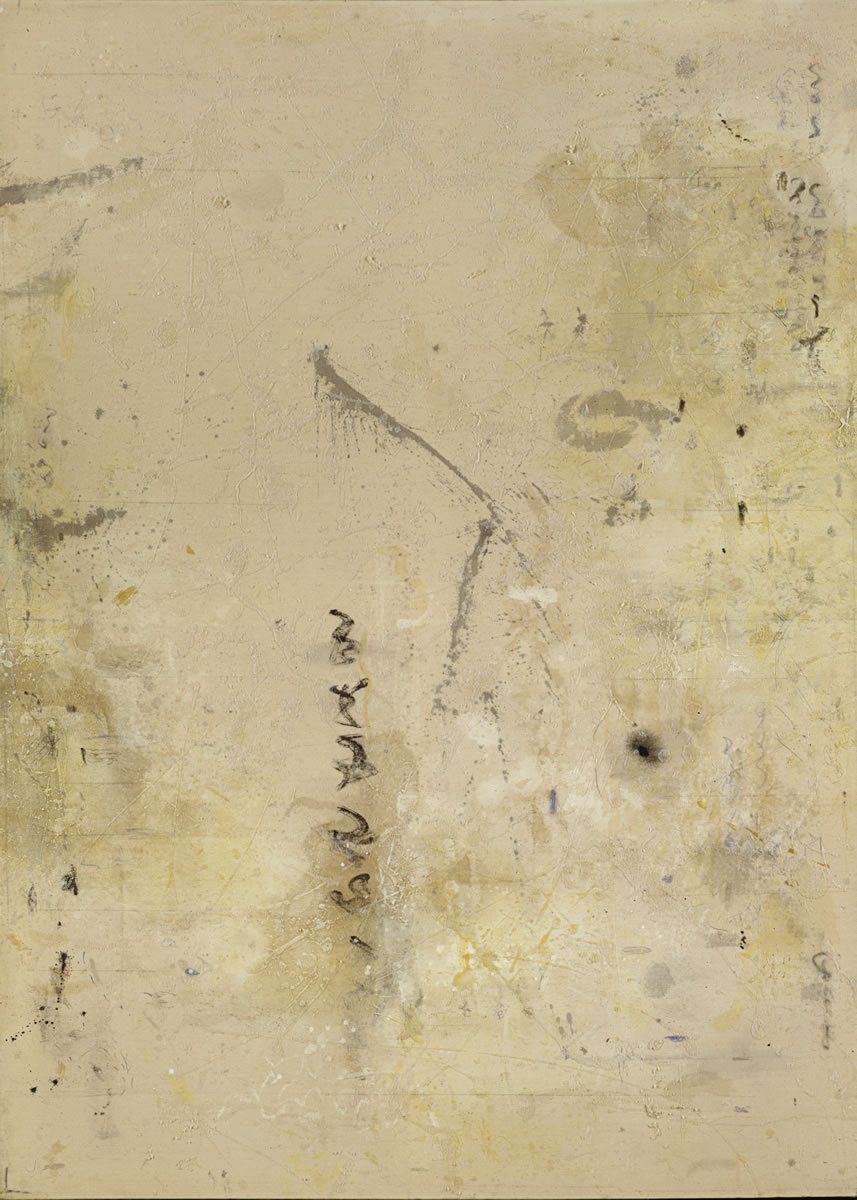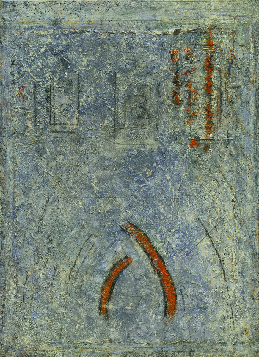 In this new series, the gestural glyphs that appear in some of the earlier mystery paintings reappear as cosmic signs, and the surface loses its reddish cast to become blue and gray. The tone has become more solemn than infernal, and more arcane than ever.
