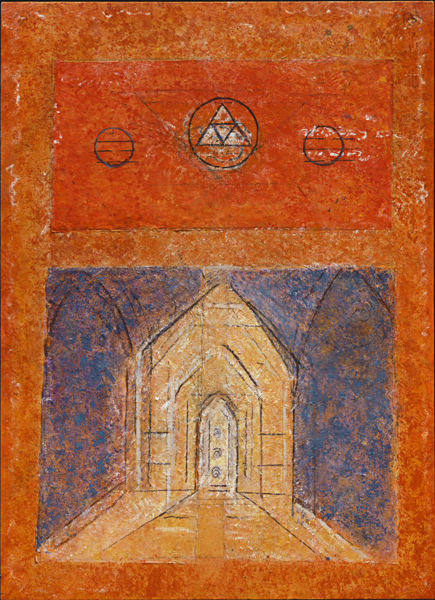 Within the ‘architecture' and the ‘topographies' of the paintings we can discern spectral presences beckoning towards us through levels of the spatial and temporal planes. Two sometimes three of these entities may coincide, distinct yet identical, emerging to and from the surface of the canvas like images gradually evoked from a tomb rubbings. Relationships of the void and the mass established by the contours of the obscured areas left after the pigment has been sprayed and brushed on adjacent areas, establish evocative allusions about physical reality and illusion as set on the two-dimensional surface in painting.