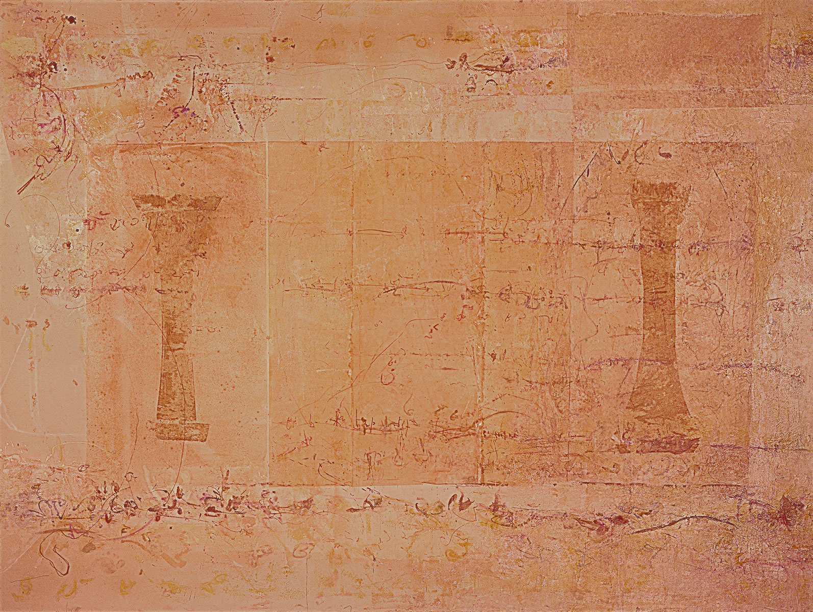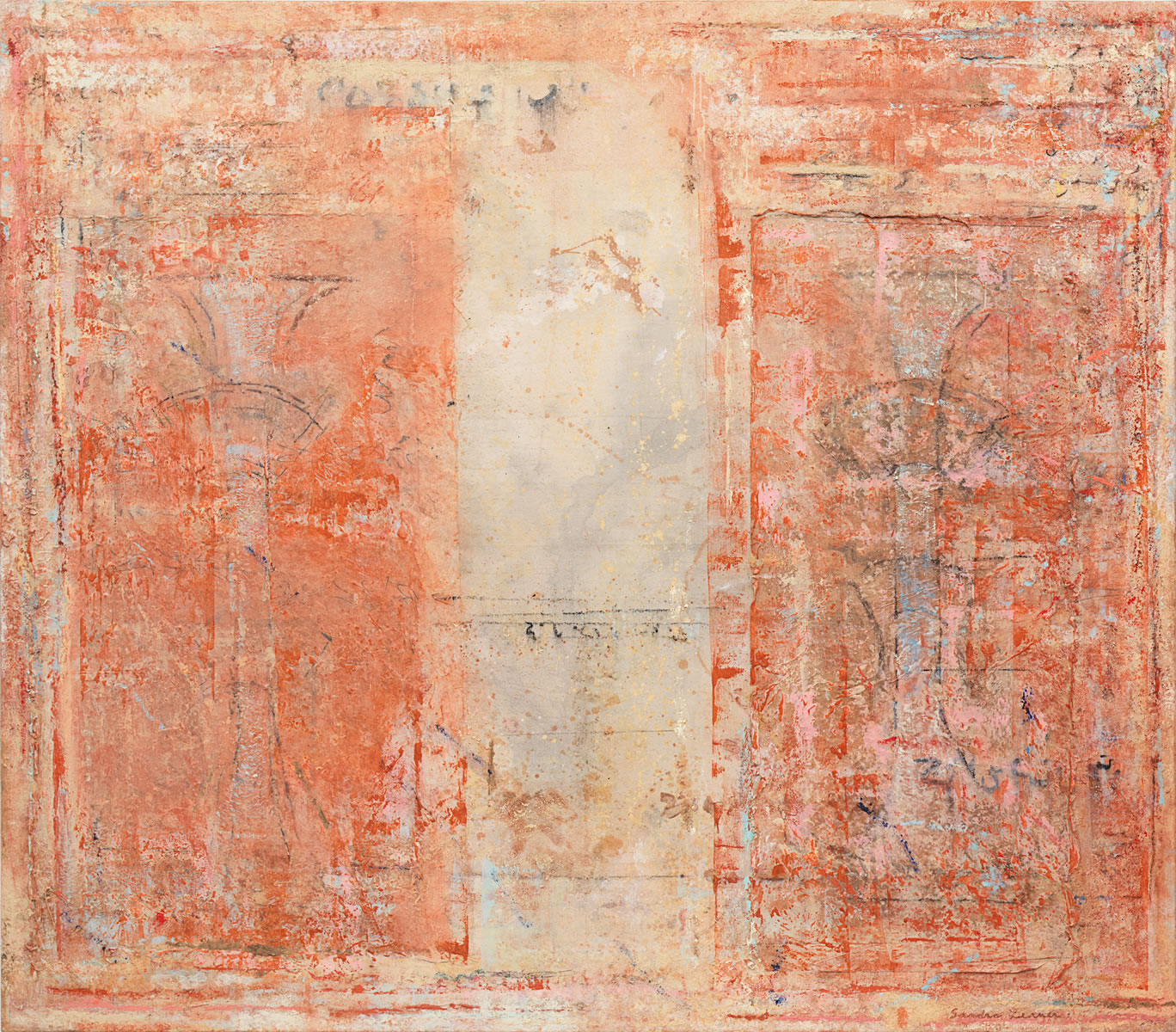In ECHOES and OMEGA, both 1989, the geometrical details seem especially crystalline, holding the intense atmosphere in suspension.Textures build up but never become unruly, over-expansive—never dissolve the various geometrical framing devices. In OMEGA, the central calligraphic gesture seems to be held in place—indeed, given its own self contained form—by the columns that flank it. such a specific and site specific gesture, so concentrated in on itself, would have been unthinkable for Lerner earlier in the decade. The sensibility of transcendence that has always informed her works has taken on a new definiteness, been given a fresh determination.