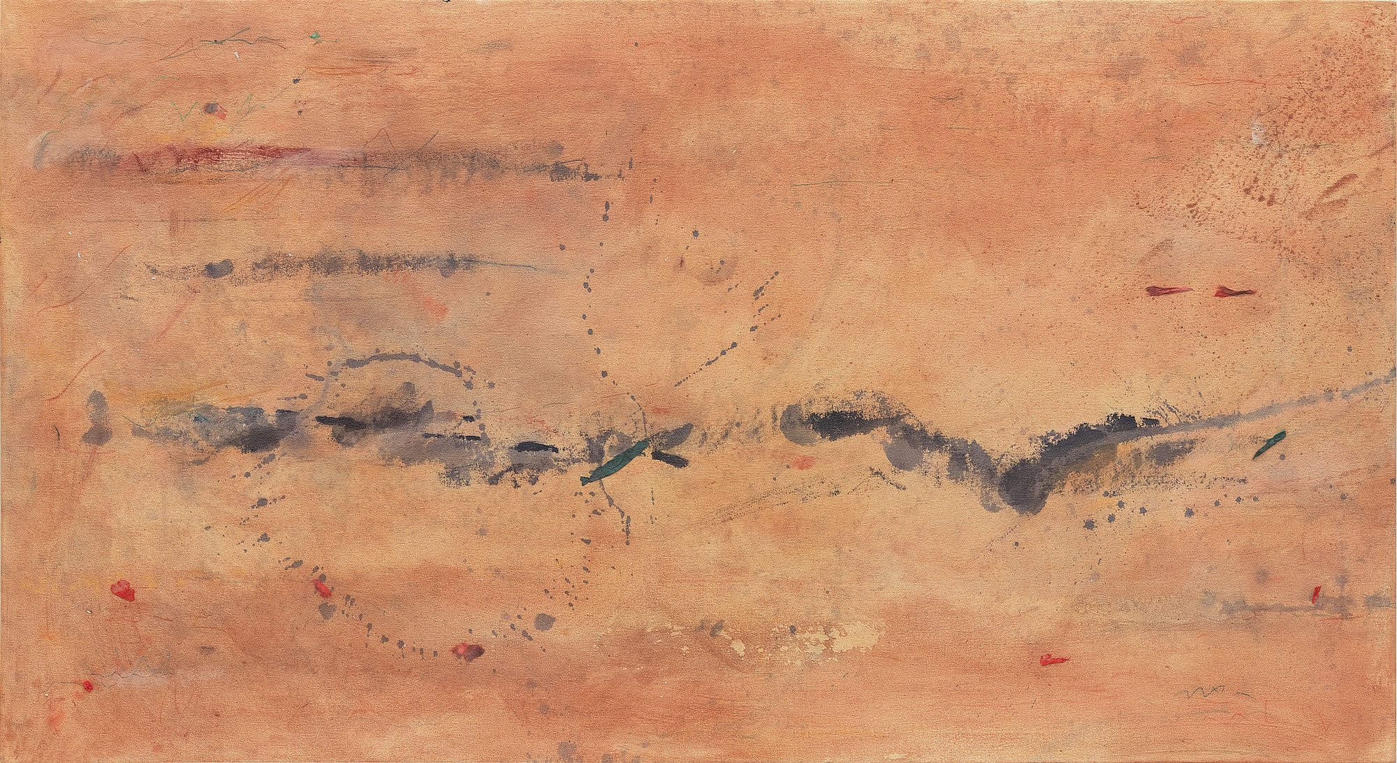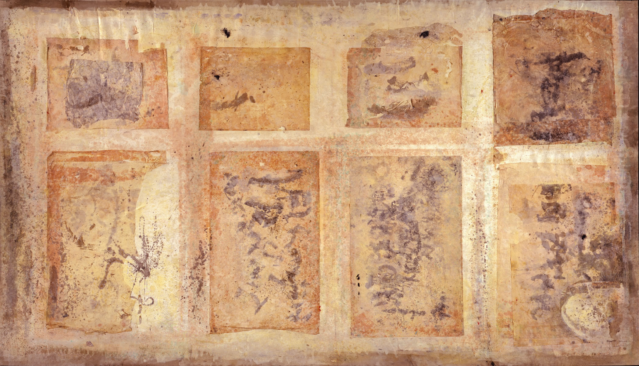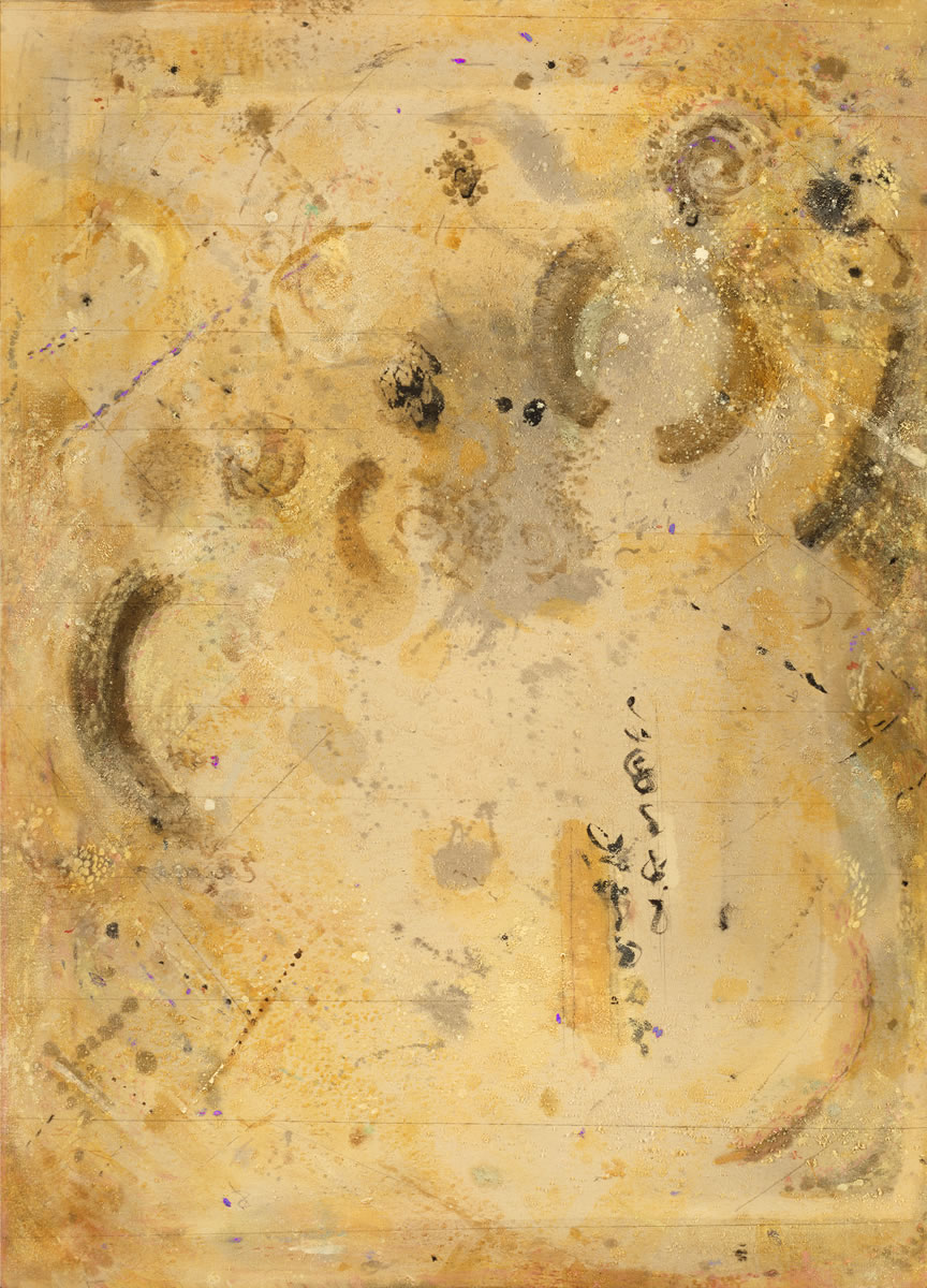 Sandra Lerner's paintings seem to float in air like elusive clouds. Lerner achieves her quietly captivating effects by combining Eastern and Western influences. Having studied calligraphy with Japanese masters and adopted Taoism and the teachings of the Chinese philosopher Lao-tzu, she has also embraced many of the techniques of Abstract Expressionism. Lerner begins, Jackson Pollock-style, by pouring and painting on immense unstretched linen canvases placed on the floor. She then cuts out sections and starts painting on them, sometimes adding sand and dust to achieve shine and translucency. Delicate lines and boxes and markings that look like writing but are not interrupt the overall fluidity of her paintings.