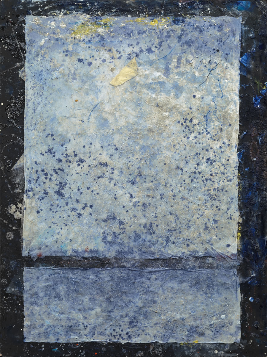 The gestures deliver a spirited spontaneity and freshness. Intentionally, and in an edgy way, this contrasts with the textured, stone-like thick impasto surface of sand, grit and collaged materials that imply a geological continuum with an ancient, storied past. The sensed weight and substance expands the types of physicality present in each work. In addition, there are paintings embellished with marble dust that produce a mysterious luminosity. Some surfaces hold ghost-like echo images with characteristics of loose stains ("Wind Song") or structural elements ("Wave"), introducing more visual richness as they activate space.