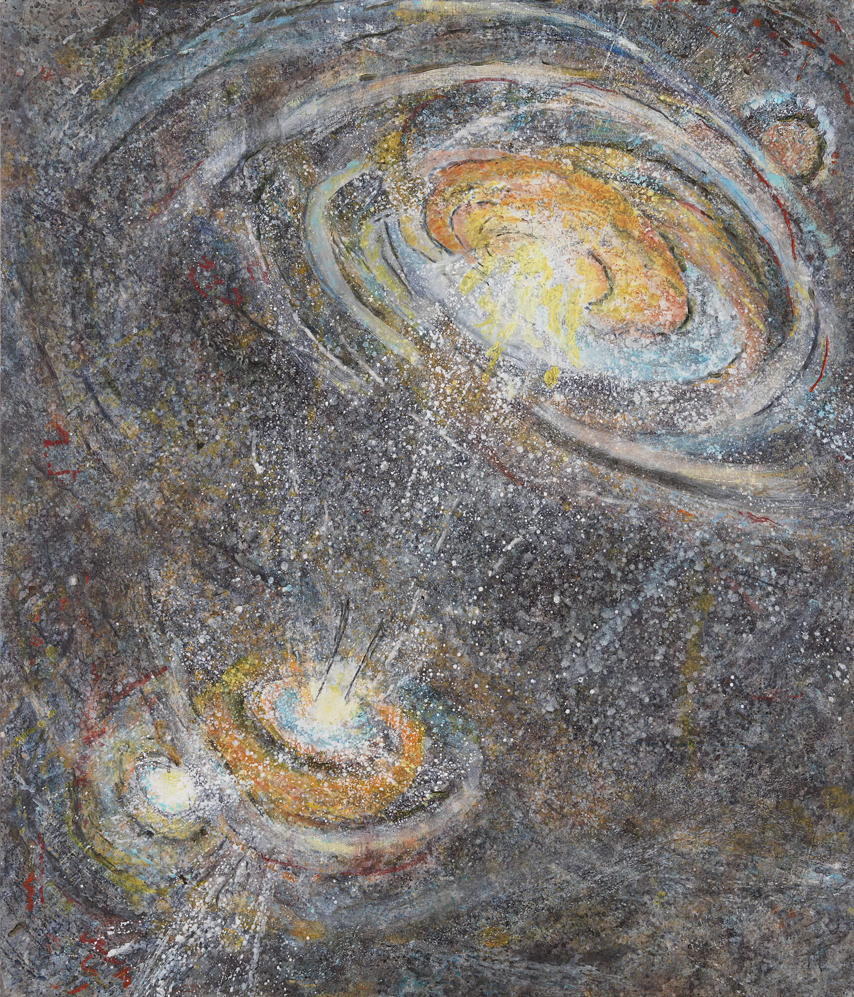 Cosmology including relativistic and quantum mechanics, as well as the mysticism of Taoist philosophy mediated by a Japanese aesthetic, have both influenced Sandra Lerner’s worldview. Pervading her art is the idea that the universe is an inseparable reality enfolding an interrelationship of all things. Also nurturing her paintings are her love of color and her visceral connection with paint’s texture plus her sensitivity to the nexus between music and visual art. All these things coalesce in her “Entanglement” paintings, which explore cosmic consequences flowing from the utterly enigmatic entanglement between subatomic particles.
